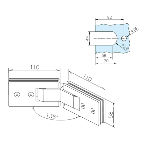 RVS glasdeurscharnier 135°, glas/glas voor glasdikte 8 - 12 mm.