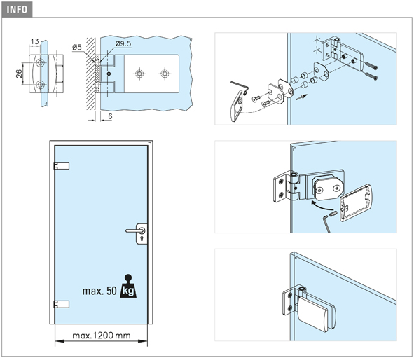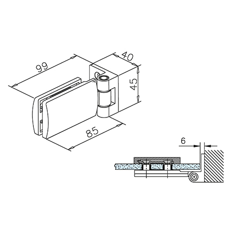 RVS glasdeurscharnier 90°, glas/wand voor glasdikte 6 - 10 mm.