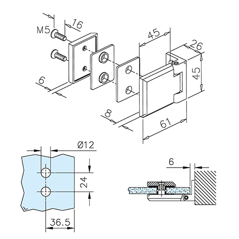 RVS glasdeurscharnier, glas/wand, voor glasdikte 6 - 10 mm.